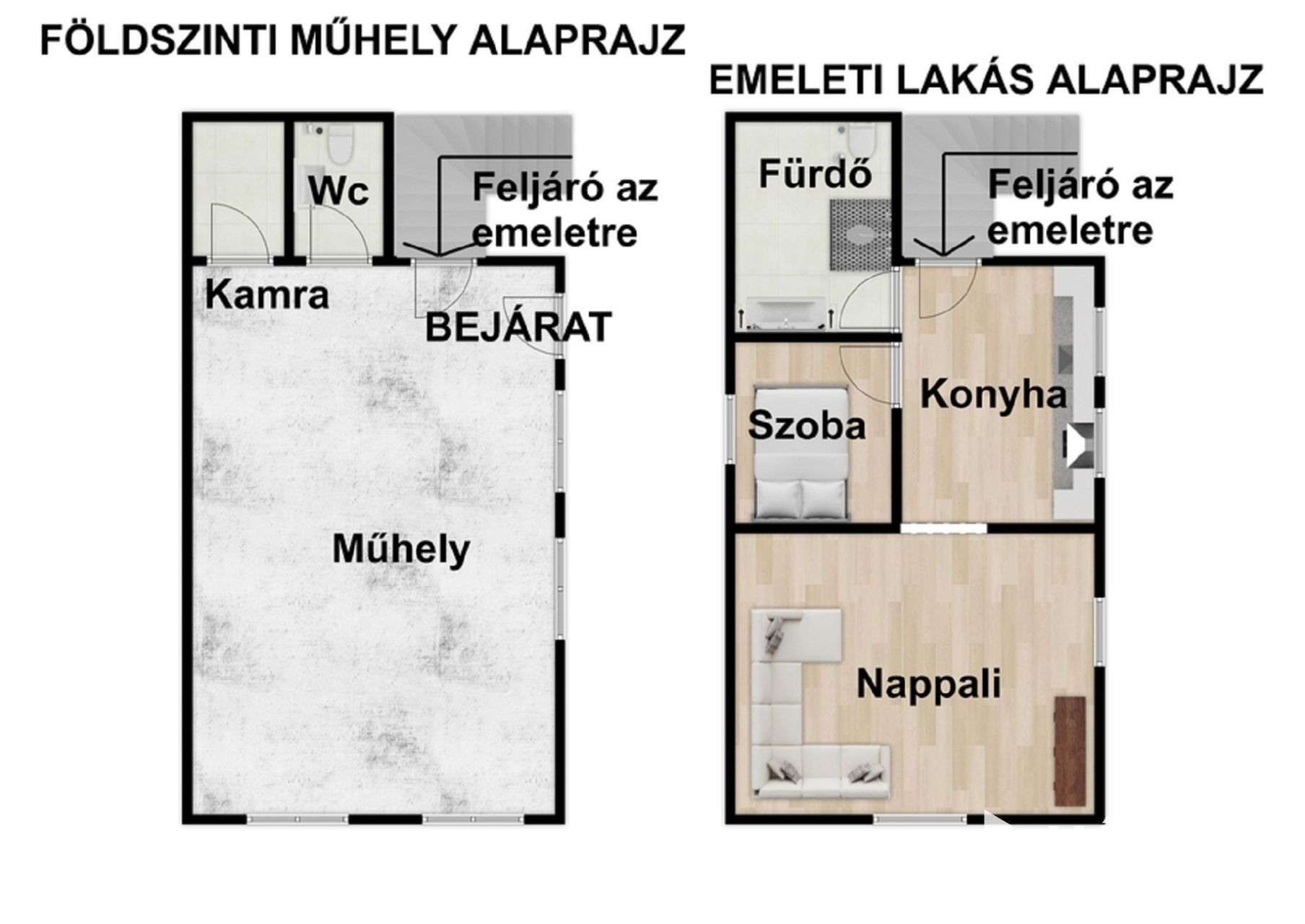 A műhely oldaláról, egy csigalépcsőn keresztül közelíthető meg a 40nm-es emeleti lakás(szoba, konyha, fürdőszoba és egy nappali) A közelmúltban teljes métékben fel lett újítva, klíma kiépítésre került. Fűtését és a meleg vizet is újszerű gázcirkó biztosítja.