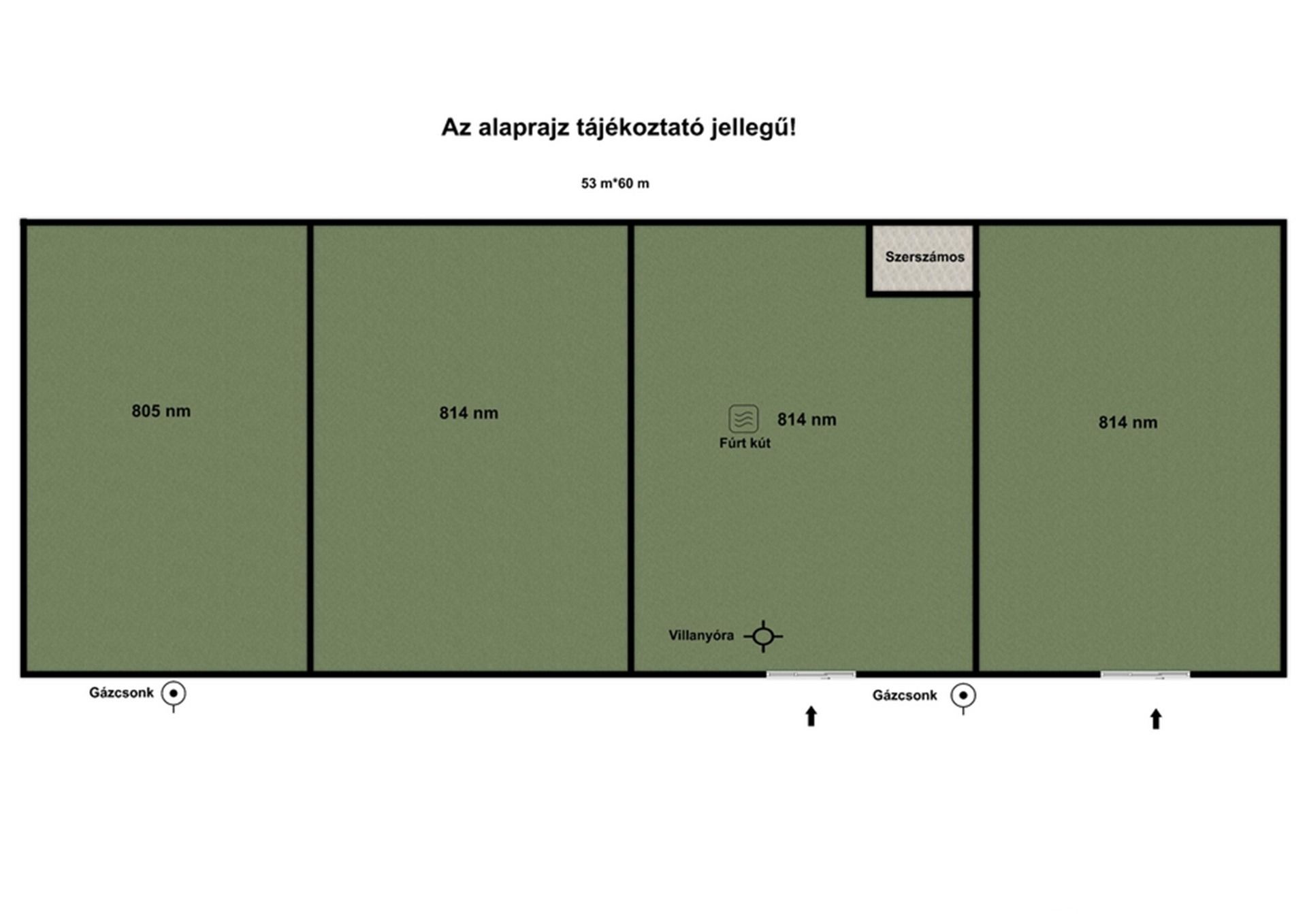3. telek: villanyóra/ áramvételi lehetőség, fúrt kút, 2,5*5 m-es szerszámos tárolóval, kapubejáróval: 814 nm