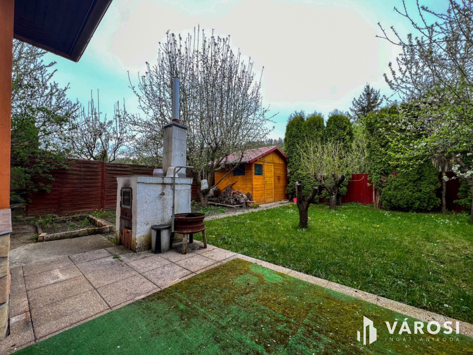 Az ingatlanhoz tartozó telek cca. 300 nm nagyságú, körbekerített, udvari gépkocsi beálló, nyitott terasz, kerti tároló, kemence, fúrt kút, tuják, gyümölcsfák találhatók.