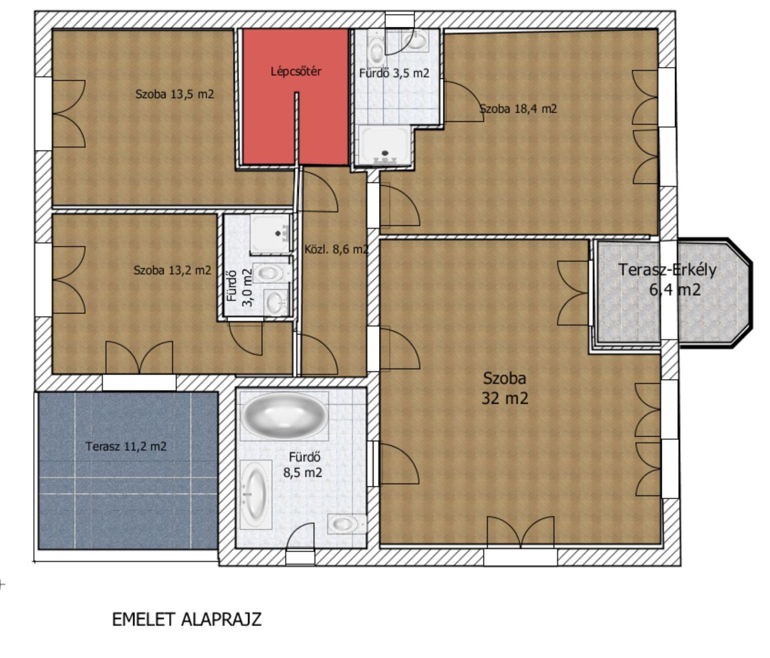 6 és fél szoba, 3 fürdőszoba +1WC kézmosóval, mosókonyha