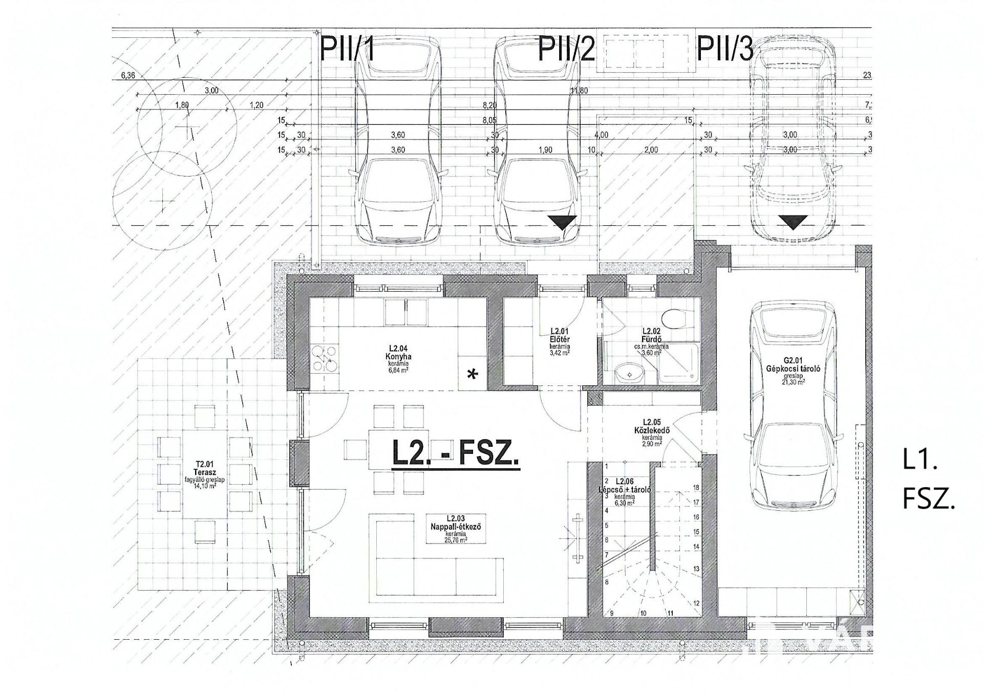 Nappali - étkező - konyha, fürdőszoba (mosdó-zuhanyzó-wc), előtér, közlekedő, lépcsőtér és garázs került kialakításra.