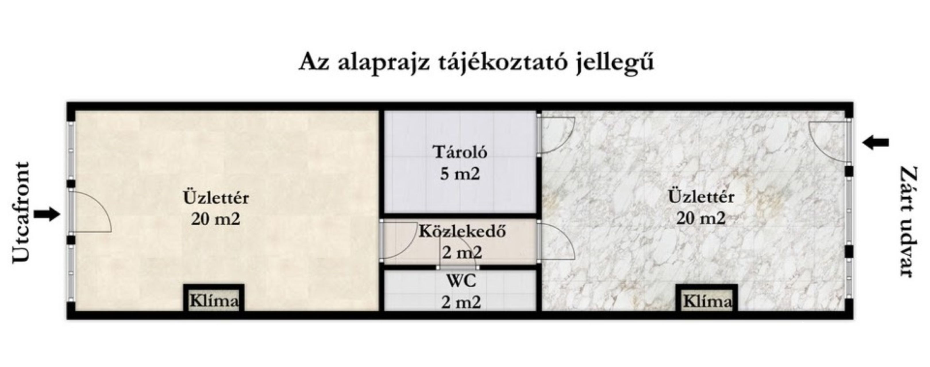 A belső kialakítás lehetővé teszi, hogy az üzlet többféle funkcióra is alkalmas legyen. Az utcafronti, közel húsz négyzetméteres üzlettér ideális ügyfélfogadásra, bemutatótérnek vagy vendégtérnek, míg a hátsó, szintén körülbelül húsz négyzetméteres helyiség – amely nagy ajtóval és ablakkal kapcsolódik a belső udvarhoz – jól használható kezelőhelyiségként, irodaként, különálló munkatérként, előkészítőként, vagy akár önálló funkcionális egységként. A két tér közötti kapcsolat lehetővé teszi, hogy az ingatlan egyszerre szolgáljon például szépségipari, egészségügyi, irodai vagy szolgáltató tevékenységet, de elrendezése miatt akár többféle üzleti modellhez is könnyen igazítható.