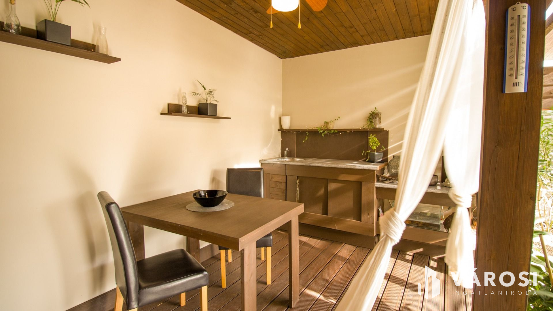 A nappaliból egy nagyméretű teraszajtón keresztül lehet kijutni a fedett teraszra, amely több mint 26 nm alapterületű. Az itt található kültéri konyha hideg - meleg vízzel ellátott. A terasz és az egész udvar a dekorvilágításnak köszönhetően sötétedés után különösen megnyerő látvány.