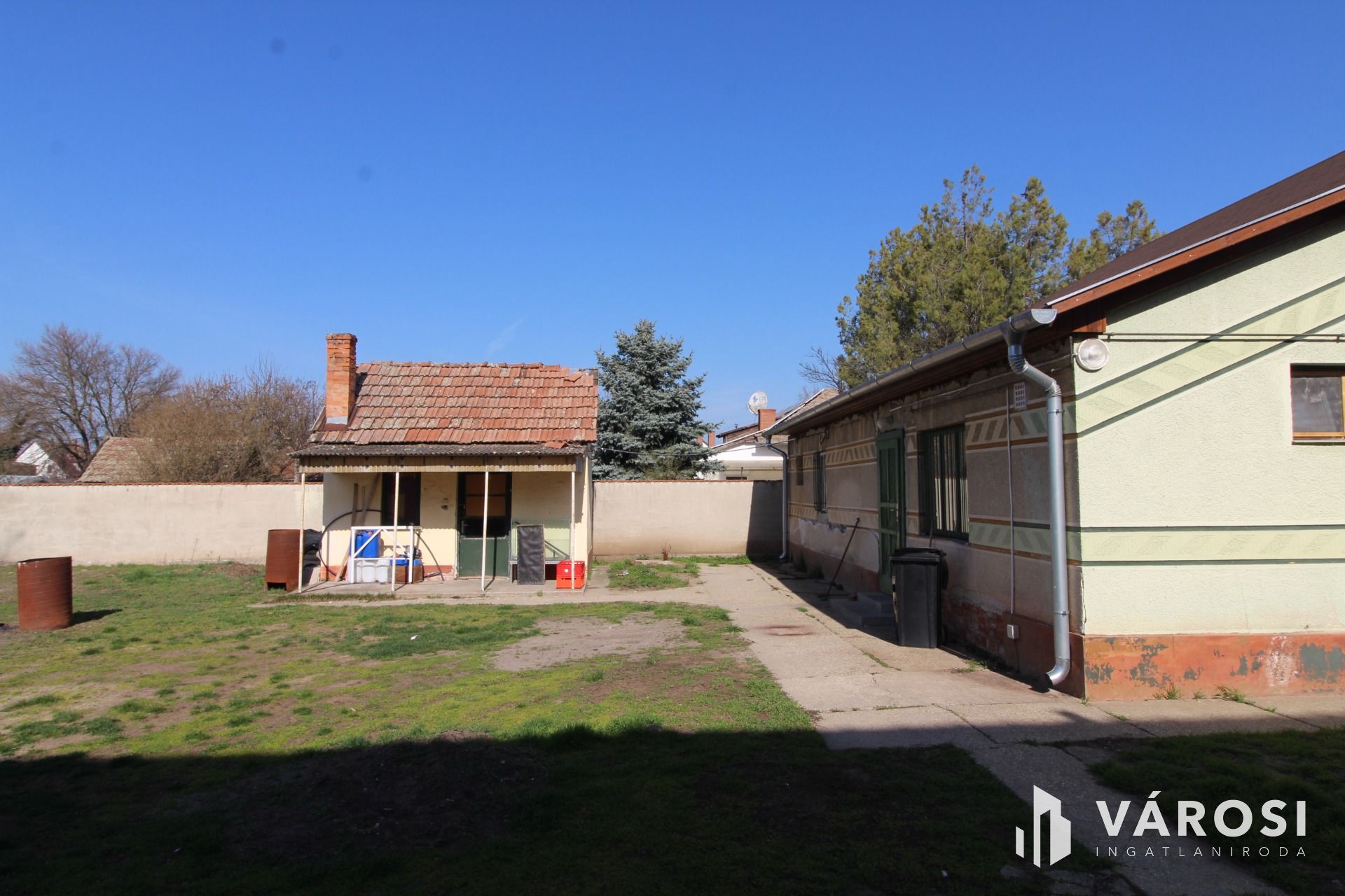 Az áru érkeztetése a nagyméretű udvar felől történik. Az udvar tiszta rendezett és egy kismértetű tároló helyiség van benne.