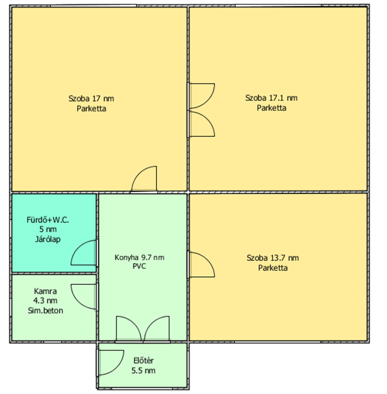 Helyiségei: 3 szoba, előtér, fürdőszoba, konyha, kamra/padlásfeljáró.