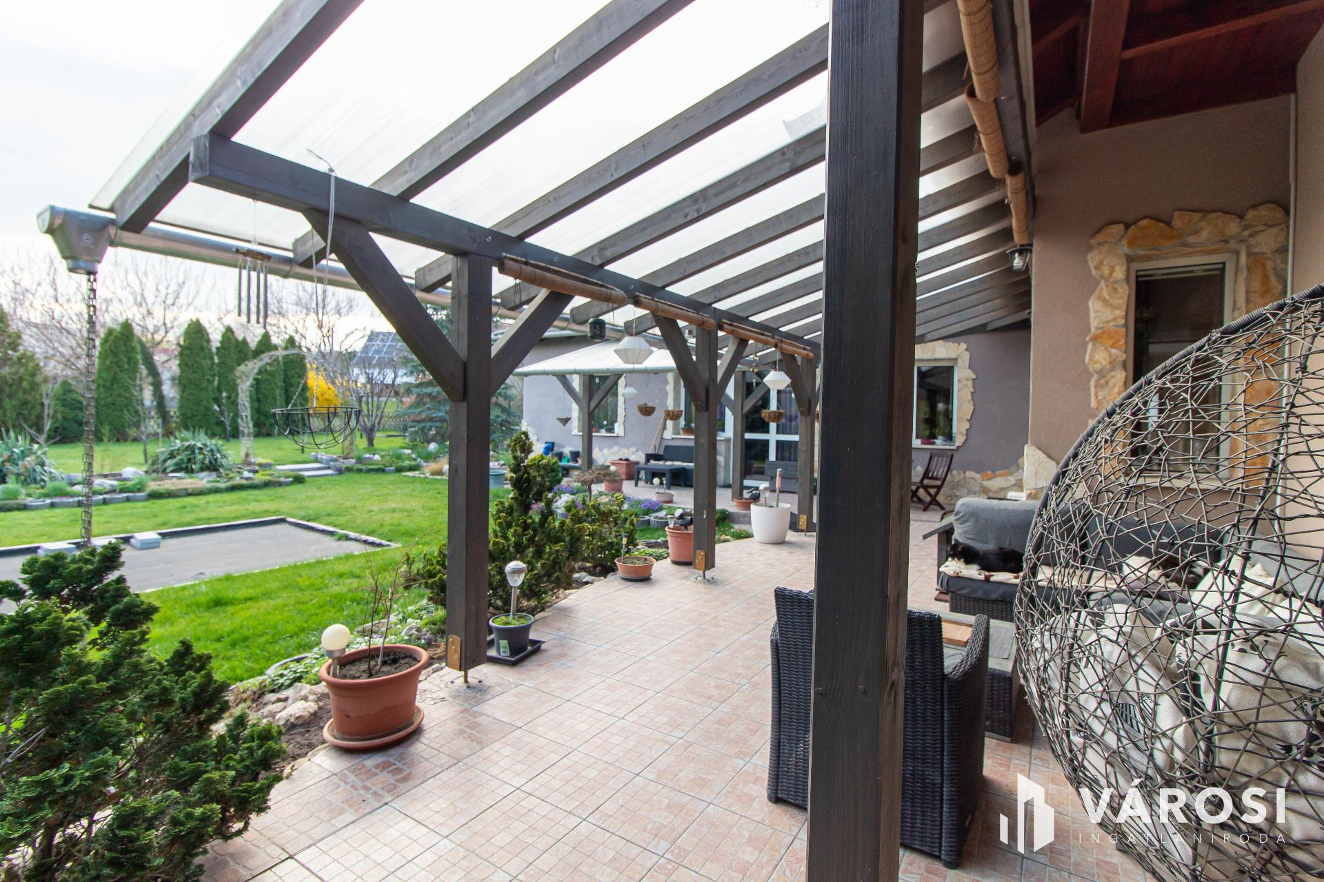A gyönyörűen parkosított, gondozott udvar és a terasz pedig remek lehetőséget nyújt a kikapcsolódásra és a szabadidő eltöltésére.Továbbá egy fúrt kút és egy tűzrakó található a kertben.