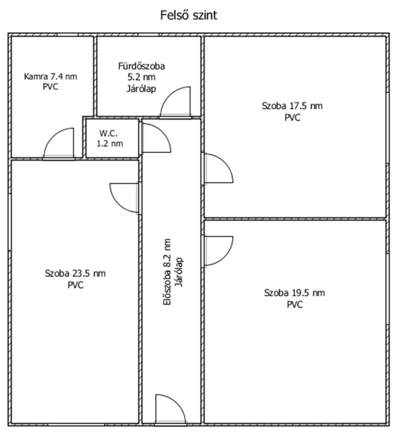 Helyiségei: a felső szinten 3 szoba, kamra, fürdőszoba, külön nyíló W.C., előszoba, az alsó szinten közlekedő, zuhanyzó, konyha, 1 szoba.