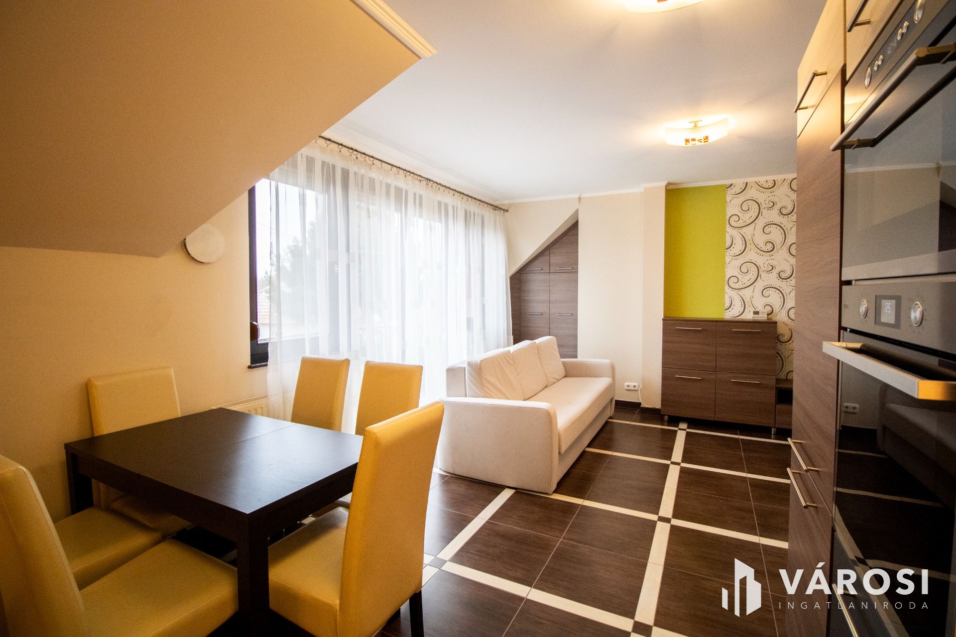 A lakás az első emeleten, a tetőtérben helyezkedik el, ahová kizárólag ehhez az ingatlanhoz tartozó, saját lépcsőházon keresztül juthatunk fel. A belső terek fiatalosak és rendkívül praktikus elrendezésűek: a közlekedőből nyílik a világos nappali és a modern konyha–étkező, amelyhez egy elegáns, kovácsoltvas korlátos erkély kapcsolódik. A két hálószoba jól szeparált, a külön WC és a mindkét irányból megközelíthető fürdőszoba pedig gondosan átgondolt, kényelmes megoldást nyújt a mindennapokban.