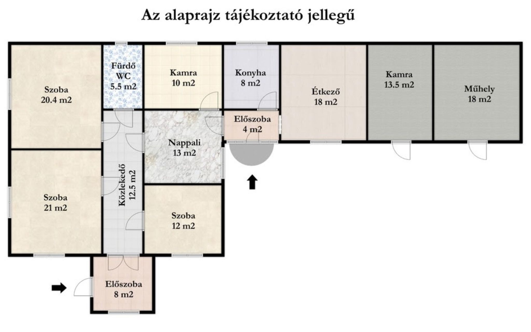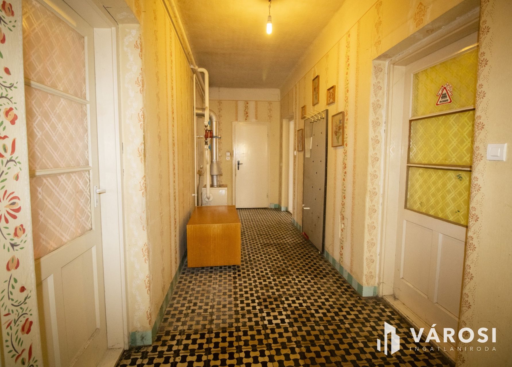 A ház dupla bejáratos: az utcafront felől előszoba és közlekedő fogad, hátulról egy külön kis előtérbe érkezünk, ahonnan szemben a konyha, jobbra az étkező, balra pedig a nappali található. A nappali mellett három különálló, nagy méretű hálószoba helyezkedik el, ezen kívül fürdőszoba és kamra tartozik még a lakótérhez. A helyiségek arányosak, jól bútorozhatók, egy nagycsalád számára is kényelmesen használhatók.