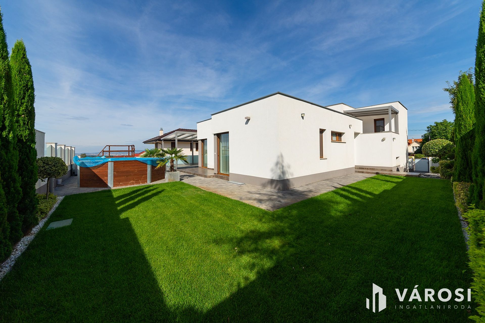 A minimalist style panoramic luxury family house built in 2021 is for sale in the most popular part of Csömör, which offers an unparalleled living space with two completely separate residential units, large terraces and a private pool.