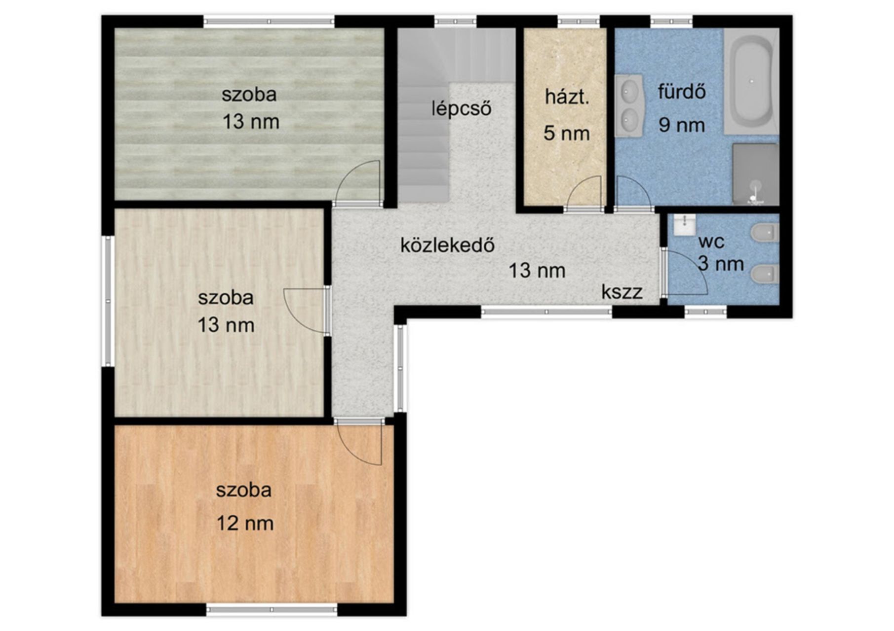 - Amerikai-konyhás nappali, 4. hálószoba, 2. fürdőszoba, WC, háztartási helyiség, hatalmas terasz.