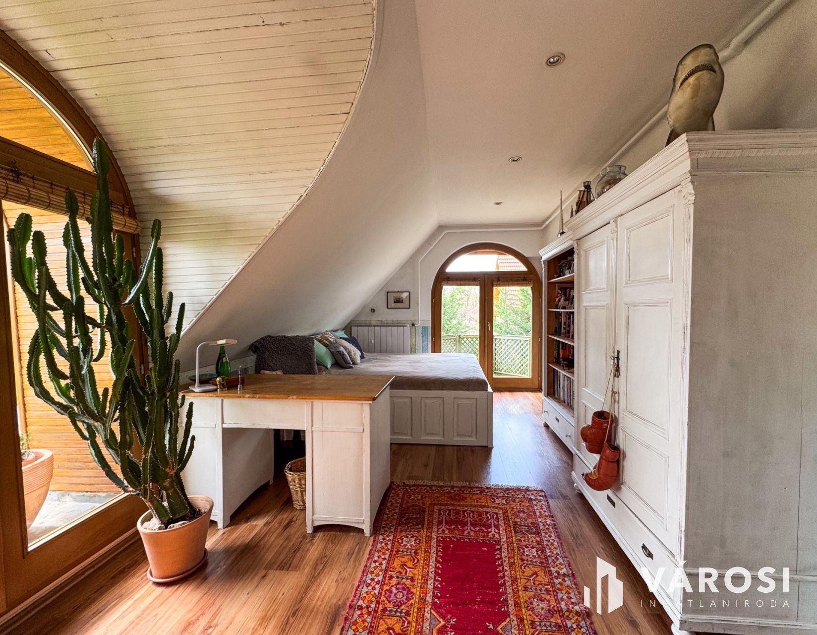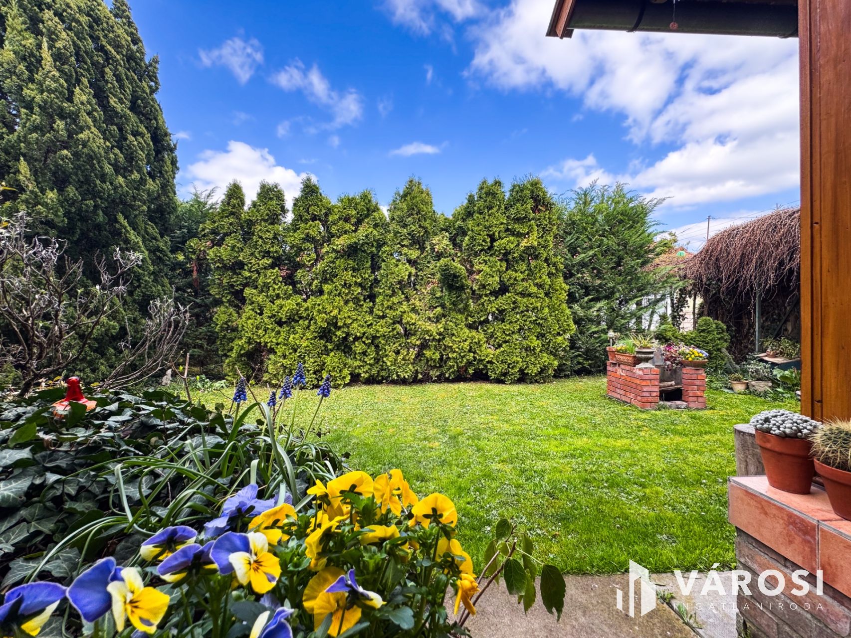 A kert igazi paradicsom a zöldövezeti életérzés kedvelőinek: fúrt kút és automata öntözőrendszer biztosítja a növények gondozását. A beépített szekrények praktikusan segítik a rendszerezést és a tárolást.