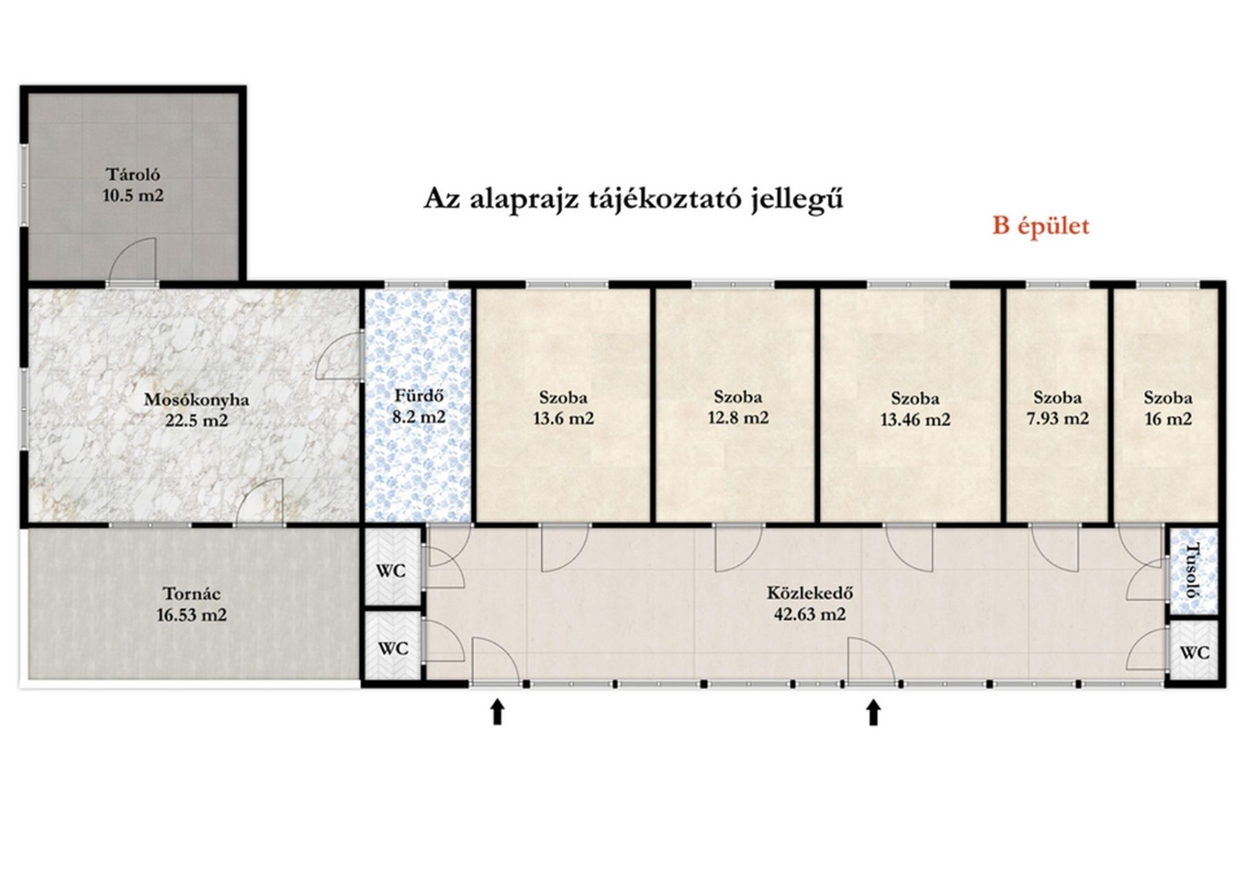 Burkolatai és színei barátságos, otthonos hangulatot árasztanak, így az épület idősek otthonaként, rehabilitációs központként vagy vendégházként egyaránt tökéletesen hasznosítható.