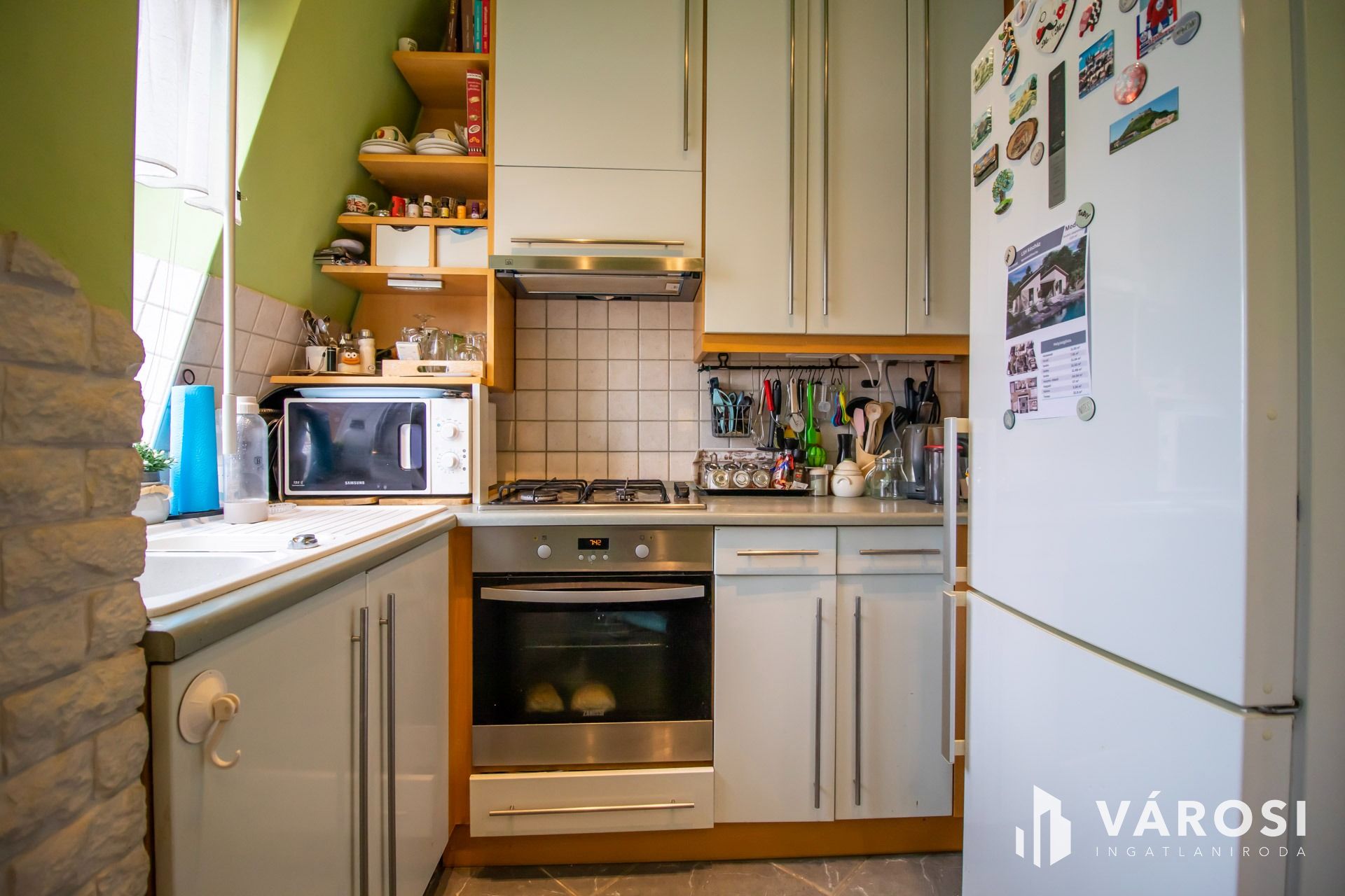 A napfényes beépített konyha kompakt méretű. Minden kéznél van és ha kell a hely, akkor a mellette levő étkezőasztal is helyet tud biztosítani az előkészítéshez.